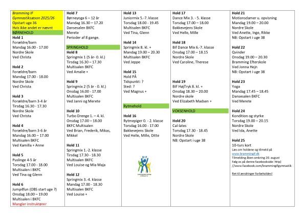 • Hvis ikke andet er nævnt, så starter holdene i uge 36. For alle hold er der tre prøvegange.